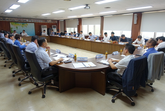 지난 14일 부산지방해양수산청 중회의실에서 ‘공(空) 컨테이너 관리 개선을 위한 주요 컨테이너 선사 관계자 간담회’가 열린 가운데 현대상선 등 국내 8개 선사와 CMA, CGM 등 외국적 8개 선사 관계자가 회의하고 있다.