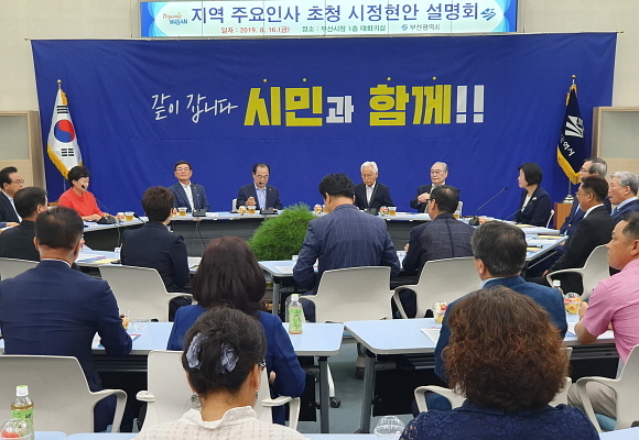 부산시가 16일 오후 1시 30분 시청 1층 대회의실에서 지역 주요 인사 120여명을 초청해 주요 시정 현안에 대해 설명하고 인사들의 정책 제안을 듣는 소통의 시간을 마련했다.