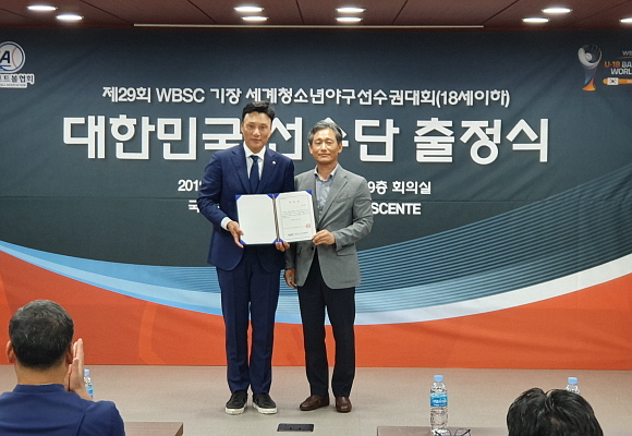 16일 오후 4시 부산시 기장군청 9층 대회의실에서 제29회 세계 U-18 야구선수권대회 출정식과 홍보대사 위촉식이 열린 가운데 이승엽 야구 장학재단 이사장이 위촉장을 받고 소감을 전하고 있다.