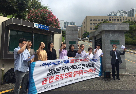 부산참여연대와 부산민주언론시민연합(민언련)이 21일 오전 11시 부산지방검찰청 동부지청 앞에서 ‘구영소 아시아드CC 전 대표의 언론 유착 의혹 수사’를 촉구하는 기자회견을 열었다.