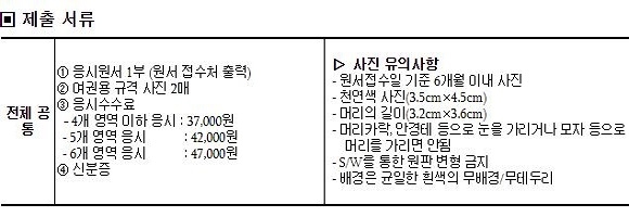 전 수험생은 응시원서를 접수할 때 최근 6개월 이내에 촬영한 여권용 규격 사진 2매, 응시 수수료, 사진이 부착된 신분증을 갖고 가야 한다.