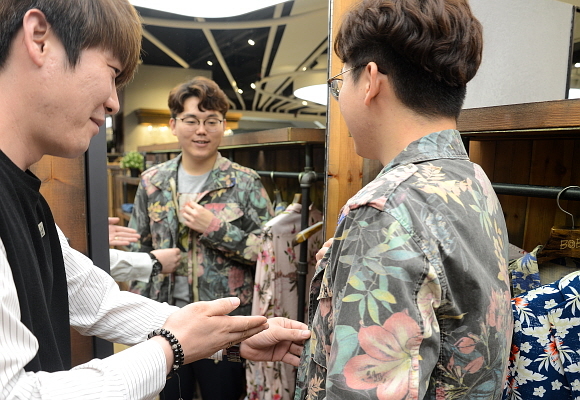 부산본점 4층에 있는 이태리 직수입 브랜드 ‘BOB’에서는 세련되고 과감한 디자인의 남성 의류를 선보이고 있다. 특히 기존 여성 의류에 많이 사용됐던 화려한 색감과 꽃무늬 패턴을 내놓으며 젠더 경계를 허물고 있다.