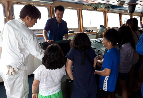 이날 부산지역 초등학생 20여명이 참여한 가운데 학생들은 실습선 한우리호에서 선박 체험을 했다.