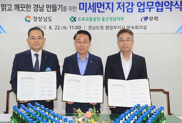 협약의 주요 내용은 ▲경남도는 미세먼지 저감을 위한 주요 정책 및 대도민 실천 방안 등 정보를 제공하고 ▲도로교통공단 울산·경남지부는 운전자의 미세먼지 인식개선과 저감을 위한 교육 및 홍보활동을 ▲무학은 홍보물품 제작 등 사회공헌 활동의 일환으로 미세먼지 저감 홍보에 노력하는 것이다.