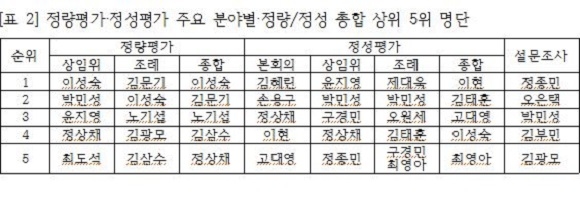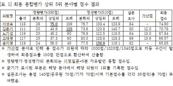 부산경실련 최종 종합평가 상위 5위 의원은 이성숙(74.90점), 김문기(70.78점), 노기섭(67.84점), 고대영(66.57점), 윤지영(65.85점) 의원 순으로 나타났다.