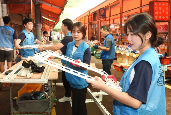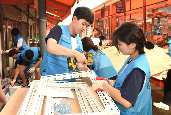 이들은 지난 6월 발대식을 시작으로 팀별 아이디어 회의, 프로젝트 계획 수립 등에 이어 이날 첫 현장 활동에 나섰다. 학생들은 이날 시장 점포 내 낡은 시설물을 보수했다.