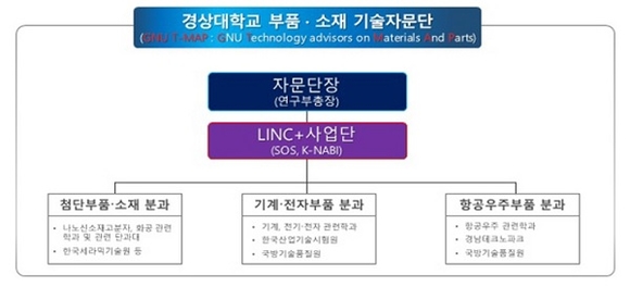 경상대는 최근 일본이 우리나라를 화이트리스트(수출 심사 우대국)에서 제외함에 따라 동남권 첨단 부품·소재, 기계·전자 부품, 항공·우주 부품 등 주요 산업의 부품·소재 원천기술 개발을 지원하는 '경상대학교 부품·소재 기술자문단'(GNU T-MAP; GNU Technology advisors on Materials And Parts; 이하 GNU T-MAP)을 구성했다고 밝혔다.