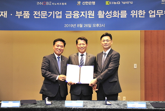 기술보증기금, 신한은행, 이노비즈 협회가 지난 26일 서울 삼성동 코엑스에서 ‘소재·부품 전문기업 금융 지원 활성화 업무협약’을 체결하고 지원에 적극 협력키로 했다고 27일 밝혔다.