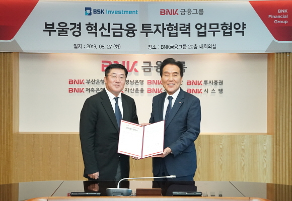 BNK금융그룹이 27일 오전 부산은행 본점에서 BSK인베스트먼트와 지역 중소벤처기업 육성·혁신 성장 지원을 위한 ‘부울경 혁신 금융 투자 협력’ 협약을 체결했다고 밝혔다.