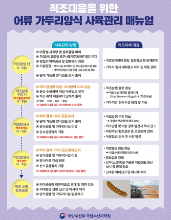 이에 수산과학원은 적조로 인한 피해를 막기 위해 ▲사육 밀도 조절 ▲소량의 먹이 공급 ▲산소의 원활한 공급을 위한 산소 공급 장치 가동 ▲판매 가능한 양식생물은 조기에 출하할 것을 권했다.