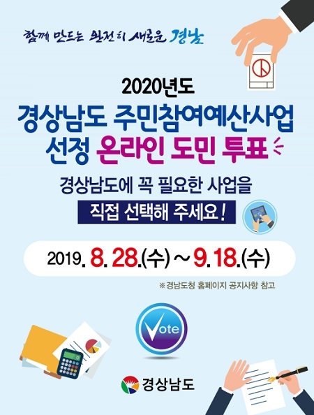 경남도가 2020년 주민참여예산 사업 선정을 위한 온라인 도민투표를 오는 28일부터 실시한다.
