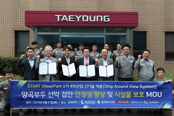 울산항만공사(UPA)는 울산항 양곡부두에서 울산항도선사회, ㈜태영인더스트리, 씨드로닉스(주)와 4차산업 신기술 적용을 통한 양곡부두의 선박 접안 안전성 향상과 시설물 보호를 위한 업무협력을 체결했다고 밝혔다.
