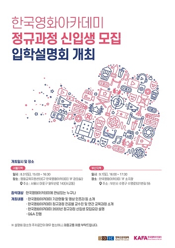 영화진흥위원회 한국영화아카데미는 내년도 정규과정 신입생 선발을 앞두고 오는 31일 서울 마포구 서교동 영화교육지원센터(구 한국영화아카데미)와 9월 7일 부산 수영구 한국영화아카데미 본원에서 입학설명회를 개최한다.