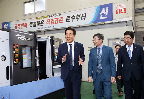 BNK금융그룹은 29일 오전 김지완 회장과 황윤철 경남은행장이 경남은행과 거래하고 있는 창원 소재 중소기업 ㈜성우를 방문했다고 밝혔다.