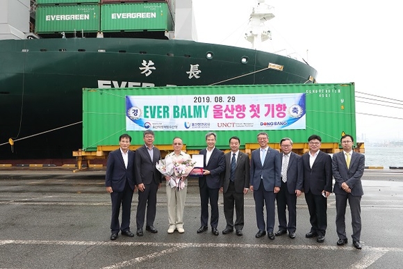 에버그린의 EVER BALMY는 오후 2시 30분경 울산신항컨테이너부두(UNCT)에 입항했다. 첫 기항 환영식에는 Jack Wu 에버그린 사장, ㈜동방 성경민 사장, UNCT 김성일 사장, 울산지방해양수산청 권영호 항만물류과장, UPA 권혁진 운영본부장 등 관련 유관기관 관계자들이 참석했다.