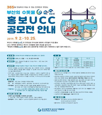 부산시상수도사업본부가 내달 2일부터 오는 10월 25일까지 부산의 수돗물인 ‘순수365’의 홍보 UCC 공모전을 연다고 30일 밝혔다.