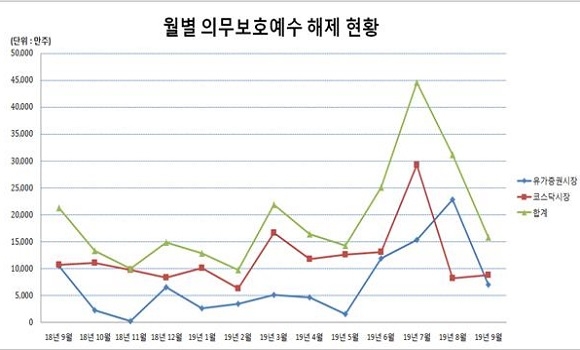 예탁결제원은 2019년도 9월 의무보호예수 해제 예정 현황 자료를 30일 발표했다.