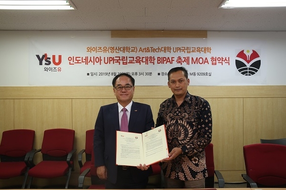 와이즈유(영산대학교) 아트앤테크(Art&Tech) 대학은 지난 29일 해운대캠퍼스에서 인도네시아 우삐(UPI) 국립교육대학과 BIPAF축제 업무협약식(MOA)을 진행했다.