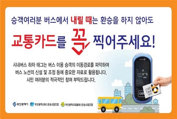 부산시가 버스 노선 개편 등 대중교통 정책 수립을 효율적으로 추진하기 위해 시민들에게 버스 하차 시 환승하지 않아도 늘 교통카드를 단말기에 찍고(태그하고) 하차할 것을 2일 권고했다.
