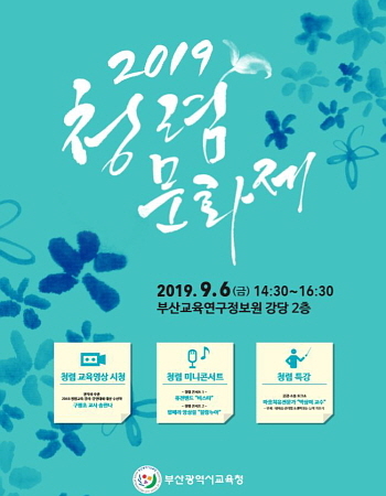 부산시교육청이 오는 6일 오후 2시 30분 부산교육연구정보원 강당에서 교직원, 학부모, 학교 운영위원 등 교육인 600여명을 대상으로 ‘2019 청렴문화제’를 연다고 2일 밝혔다.