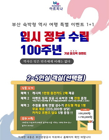 부산관광공사 아르피나가 대한민국 임시정부 수립 100주년을 맞아 지난 1일부터 오는 12월 1일까지 ‘역사 인문학 자유여행 이벤트’ 상품을 객실 100개 한정 판매한다고 2일 밝혔다.