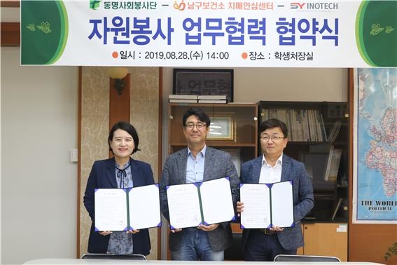 동명대학교는 지난 28일 동명사회봉사단, 남구보건소 치매안심센터, ㈜에스와이이노테크 상호간 '자원봉사 업무협약식'(MOU)을 가졌다고 2일 밝혔다.