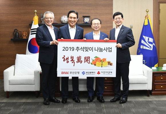 먼저 부산은행은 지난 3일 오후 부산시청에서 부산지역 소외계층의 차례상 차림 지원을 위해 4억 4000만원 상당의 ‘명절 복 꾸러미’를 전달하는 ‘2019 추석맞이 나눔 사업 행복 만개(萬開)’ 행사를 진행했다.