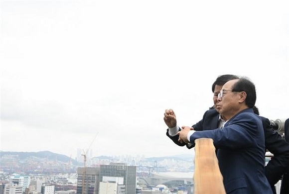 이어 오후 2시 20분경 초량동 168계단을 방문해 모노레일을 타고 전망대에 올라 북항 일대를 배경으로 동구를 비롯한 원도심 발전 계획을 보고 받았다.