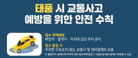 공단 관계자는 태풍으로 인해 교통사고 발생건수가 증가하는 것은 강한 비와 바람의 영향일 수 있다고 설명했다. 연구에 따르면 강풍이 부는 경우 주행 경로를 벗어나기 때문에 강풍 시 낙하물 사고와 대형차량 인접 등에 각별한 주의를 기울여야 한다고 말했다. 또 젖은 노면에서는 ‘제동거리’가 평상시보다 약 1.7배 증가하므로 운전자는 주행 시 반드시 속도를 줄여야 한다고 당부했다.