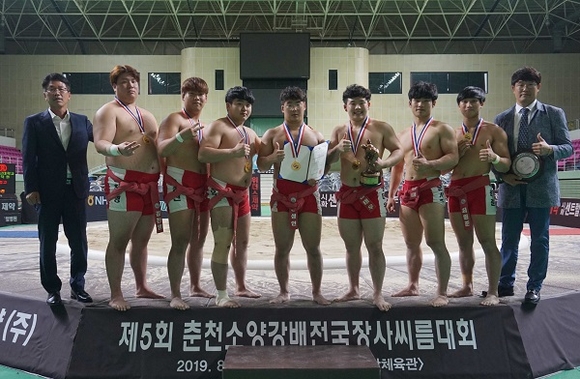 경남대학교 씨름부가 지난 30일 강원도 춘천시 호반체육관에서 열린 '제5회 춘천소양강배 전국장사 씨름대회' 대학부 단체전에서 우승을 차지했다.