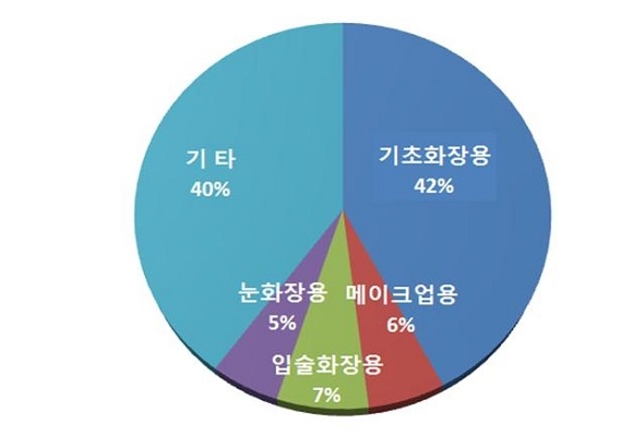 주요 수출 품목은 ▲마스크팩을 포함한 기초화장용 제품 42% ▲핸드크림 등 기타 화장품 제품 40% ▲입술 화장용 제품 7% 등의 순으로 비중이 컸다.