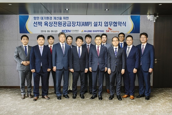 한국남동발전은 6일 에이치라인해운 본사에서 에이치라인해운 및 SK해운과 ‘항만 대기환경 개선을 위한 선박 육상전원공급장치 설치 업무협약’을 체결했다고 밝혔다.