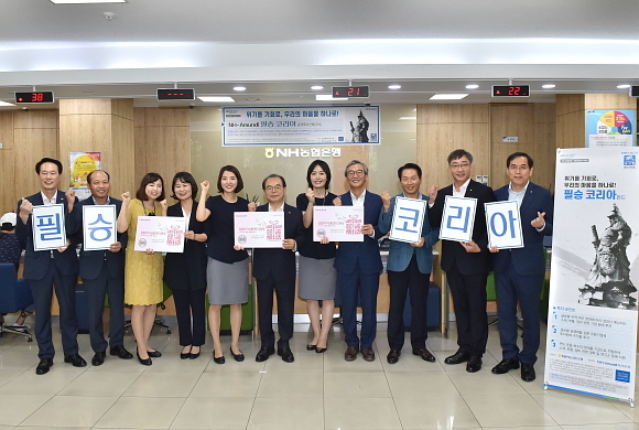 오거돈 부산시장과 박인영 부산시의회 의장, 전재수 더불어민주당 부산시당위원장이 9일 오전 10시 NH농협은행 부산시청지점에서 ‘필승코리아 펀드’ 가입식을 열었다.