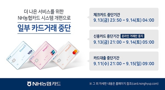 한편 NH농협카드는 대고객 문자 및 이메일발송, TV 및 라디오 를 통한 대국민 광고뿐만 아니라 청구서, 영업점 포스터, 자동화 기기, 카드앱 및 홈페이지, ARS 등 모든 채널을 활용하여 고객 불편이 최소화 될 수 있도록 사전 안내에 총력을 기울이고 있다.