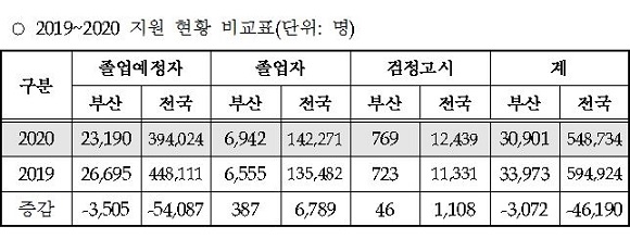 부산시교육청이 지난달 22일부터 지난 6일까지 2020학년도 대학수학능력시험(수능) 응시 원서 접수 결과, 총 3만 901명이 지원했다고 10일 밝혔다. 이는 지난해보다 3072명 감소한 수치다.