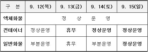 추석 연휴기간 중 유류·석유화학제품 등 액체화물 취급부두는 휴무 없이 정상 하역체제를 유지하고 컨테이너 터미널은 추석 당일에만 휴무, 일반화물은 휴무(추석 당일) 및 부분 운영한다. 다만 긴급화물은 하역작업에 차질이 없도록 사전에 부두운영회사에 요청하면 작업이 가능하므로 이용에 불편이 없도록 일정표를 참고하면 된다.