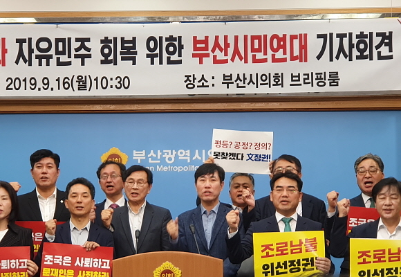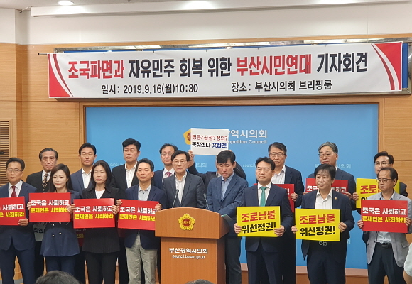 자유한국당 부산시당과 바른미래당 부산시당이 ‘조국 파면 부산시민연대’를 출범하고 16일 부산시의회 브리핑실에서 조국 임명 반대의 목소리를 외치는 첫 기자회견을 열었다.