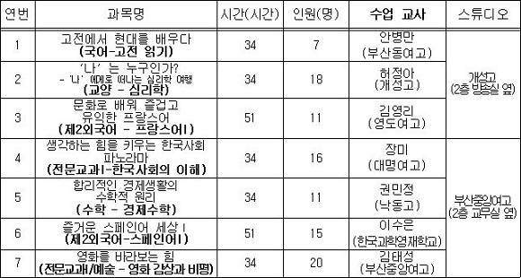 해당 교실은 지난 1학기 만족도가 높았던 4개 과목과 ‘나에게로 떠나는 심리학 여행’ ‘문화로 배워 즐겁고 유익한 프랑스어’ ‘영화를 바라보는 힘’ 총 7개 과목으로 운영된다.