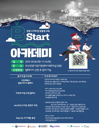 부산시와 부산관광공사가 오는 17일부터 24일까지 부산 관광산업 생태계 조성을 위한 맞춤형 교육 프로그램인 ‘B-스타트 아카데미’에 참여할 교육생을 모집한다고 16일 밝혔다.