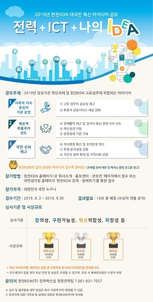 한전KDN이 이달 30일까지 ‘2019년 한전KDN 대국민 혁신 아이디어 공모’를 시행하고 있다고 16일 밝혔다. 이번 공모전은 국민의 주도적 참여에 기반한 기관 혁신 과제를 발굴하고 국민이 체감할 수 있는 혁신성과를 창출하기 위해 전 국민을 대상으로 실시한다.