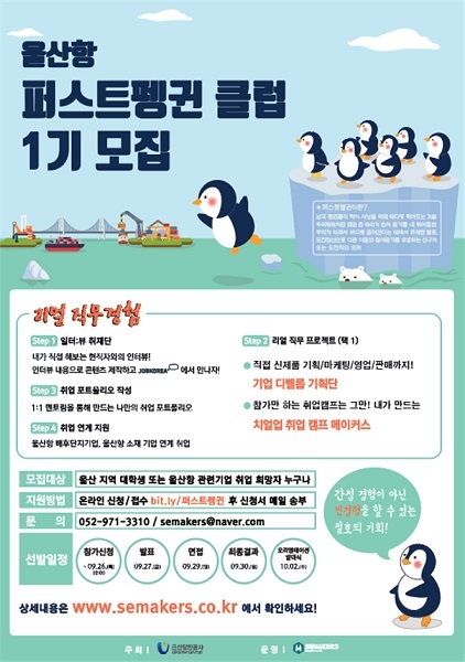 이번 공개모집을 통해 ‘울산항 퍼스트펭귄 클럽’에 참가하는 청년들은 ▲일터뷰 취재단 활동 ▲기업 디벨롭(Develope) 기획단 ▲취업캠프 메이커스 활동 ▲다양한 취업역량 강화 프로그램을 지원받는다.