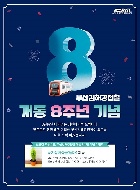 부산김해경전철이 개통 8주년을 맞아 고객 감사의 의미로 친환경 공기정화 식물 나눔 이벤트를 진행한다.