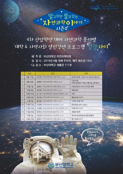 자연대는 12주간 펼쳐지는 이 프로그램에 생명과학·수학·화학·지질환경과학·물리학·대기환경과학·통계학·해양학 등 부산대 자연대 내 각 전공 교수들이 참여해 생활 속 궁금증을 해소하고 유익하게 적용할 수 있는 자연과학 정보를 제공할 계획이다.