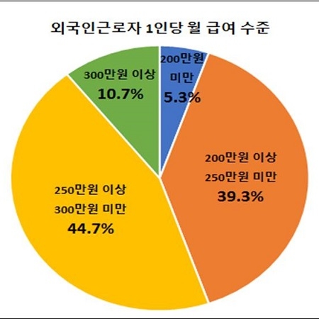 조사결과 해당 기업의 외국인 근로자 1인당 월평균 급여는 246만원으로 집계됐다. 이는 지난해 교육부에서 ‘2017년 고등교육기관 졸업자 취업 통계’를 통해 밝힌 국내 대졸 취업자 초임 평균 232만원을 넘어서는 수준이다.