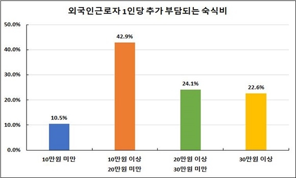 외국인 근로자의 숙식비는 조사기업의 95.3%가 제공하고 있었으며 월평균 1인당 20만원 수준이었다. 구간별로는 10~20만원 미만이 42.9%로 가장 많았으며 20~30만원 미만이 24.1%다.