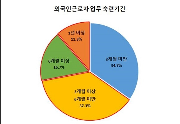 또 이들이 업무를 수행하는 데 필요한 숙련에 3개월 넘게 걸린다고 응답한 업체 비중이 65.3%로 가장 많았으며 이 가운데 1년 이상 걸린다고 한 업체도 11.3% 되는 것으로 확인됐다. 이에 외국인 근로자의 수습기간을 연장해달라고 요구하는 기업의 목소리가 커지고 있다.