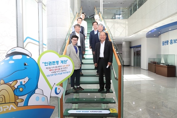 울산항만공사(이하 UPA)는 18일 울산항마린센터 1층과 2층을 연결하는 유리계단 앞에서 임원들과 ‘인권존중 계단’의 취지를 이해하고 고객과 임직원의 인권존중이 얼마나 중요한지 생각해보는 ‘인권존중 계단’ 오픈식을 진행했다고 밝혔다.