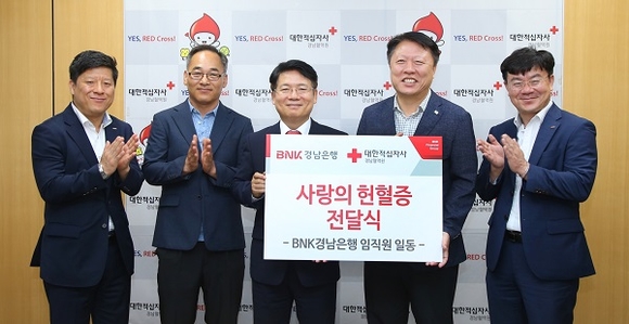 BNK경남은행은 19일 사랑나눔활동의 일환으로 대한적십자사 경남혈액원에 ‘사랑의 헌혈증’을 기부했다고 밝혔다.
