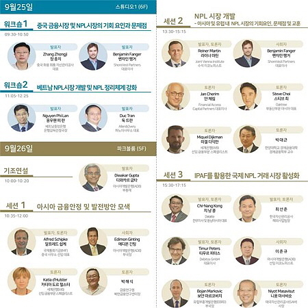연차총회 첫날인 25일 오전에는 장 종지 중국 화융회통자산관리공사 대표와 응우웬 피 란 베트남중앙은행 국장이 중국·베트남 부실채권시장의 기회 요인과 시장 개발에 대해 발표한다. 오후에는 회원기관 간 대표회담, 양자회담이 열린다.