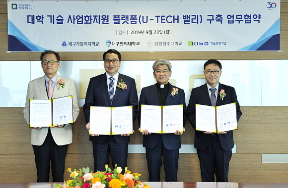 기술보증기금(기보)이 지난 23일 서울 여의도 63스퀘어에서 대구가톨릭대, 대구한의대, 강릉원주대와 ‘대학 기술사업화 지원 플랫폼(테크밸리) 구축 업무협약’을 체결했다고 24일 밝혔다.